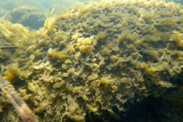 Algae proliferates on rocks in the lower Deschutes. pH levels in excess of state standards, a sign of excessive aquatic plant growth, have been measured every day so far this monitoring season at all three stations.