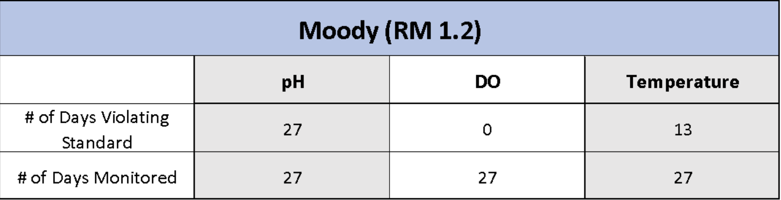 Water quality measurements from all three sites reflect daily violations of the state pH standard. Water temperatures at the Moody site are also in violation of the state standard, 13 of 27 days.