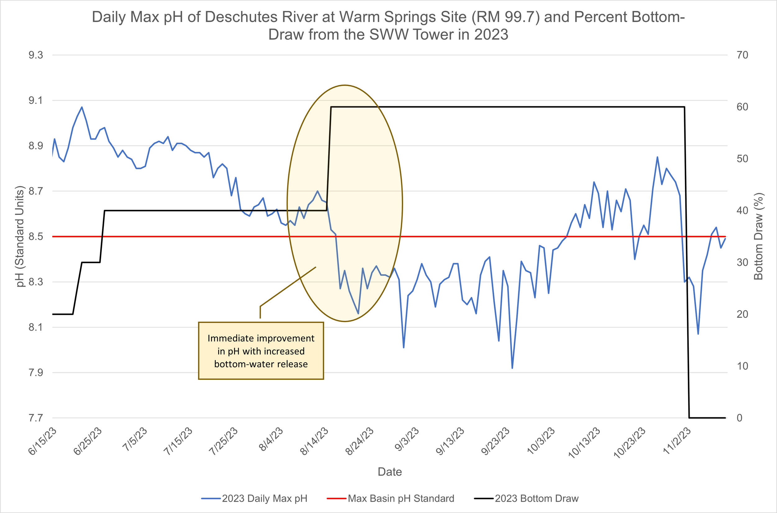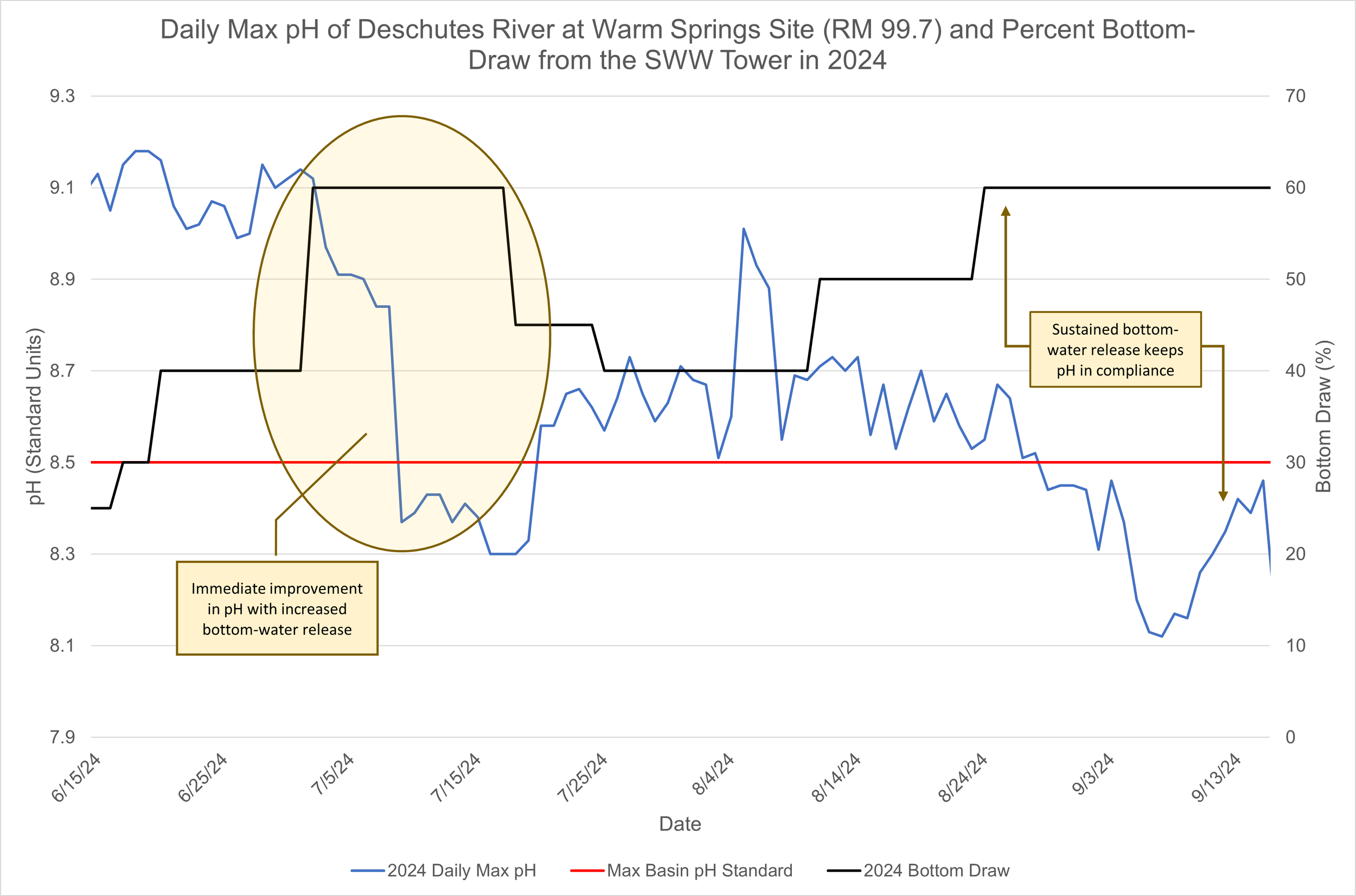 Our data shows that when water from the bottom of the reservoir is released into the lower Deschutes, water quality standards quickly come into compliance. Graphs below depict pH coming into compliance in each of the past three years for which data is available:
